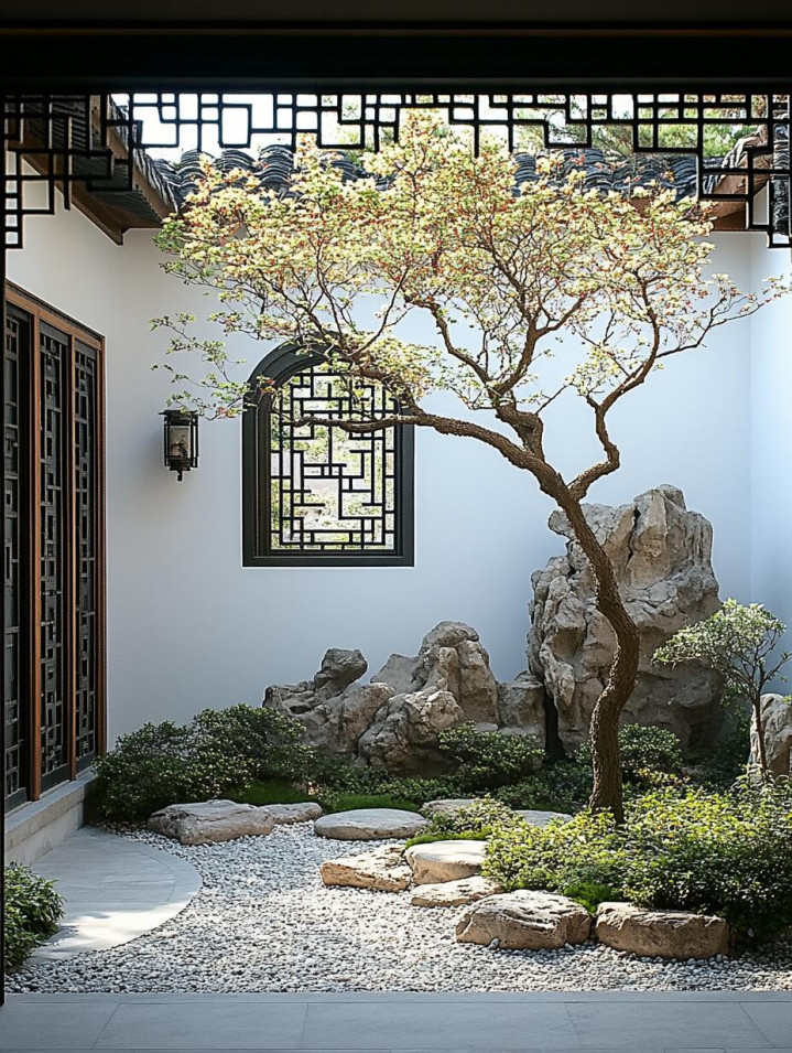 ▶ 自然入画,天人合一: 高墙围合,绝不是为了封闭!巧妙堆叠的太湖石,模拟山峦意趣;几竿翠竹倚窗摇曳,自成风景;一池睡莲映着天光云影...这些都不是单纯的装饰,是“师法自然”的顶级智慧在闪光! 在钢筋水泥的都市里,硬生生劈出一方野趣盎然的天地,连呼吸都带着草木的清甜。这才是真正的奢侈!