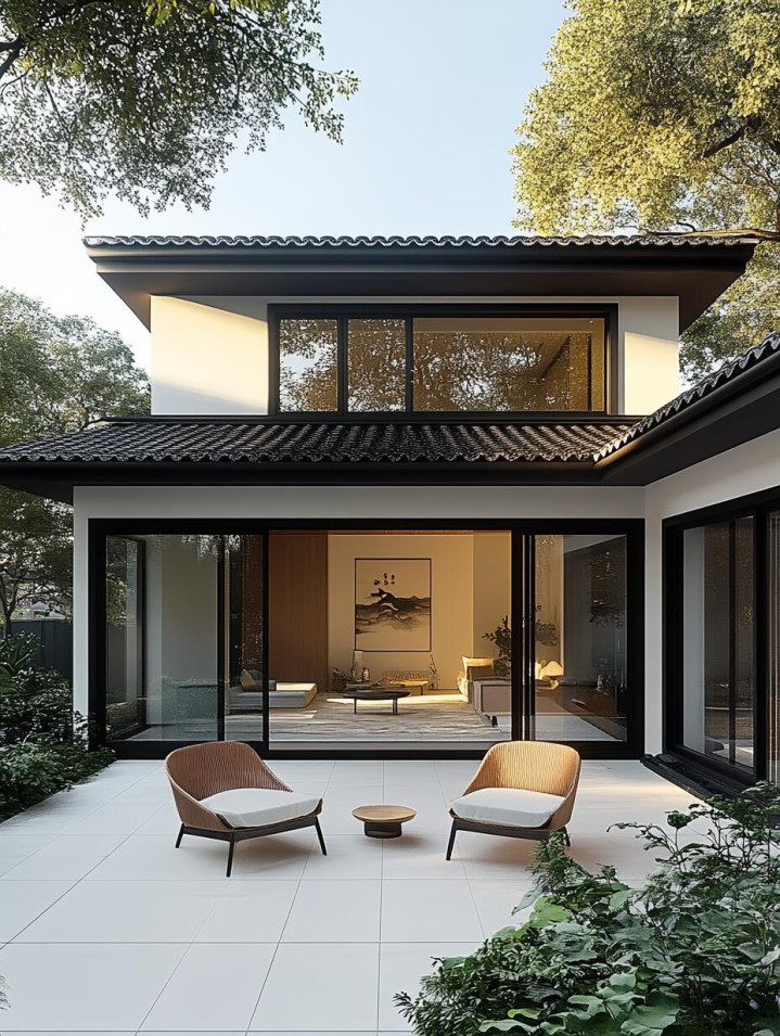 ▶ 古今混搭,舒服到骨子里: 千万别以为只有老物件!聪明的新中式,玩的是“混搭高手”: 大面积的落地玻璃窗,通透敞亮,把满院子的绿意“偷”进客厅,模糊了室内外的界限。 现代材质的简约廊架下,摆着线条流畅的明式圈椅,坐感舒适又风雅。 老灵魂穿上了新衣裳,采光、通风、实用性,样样照顾周全——这才是为现代人量身定制的“神仙居所”!